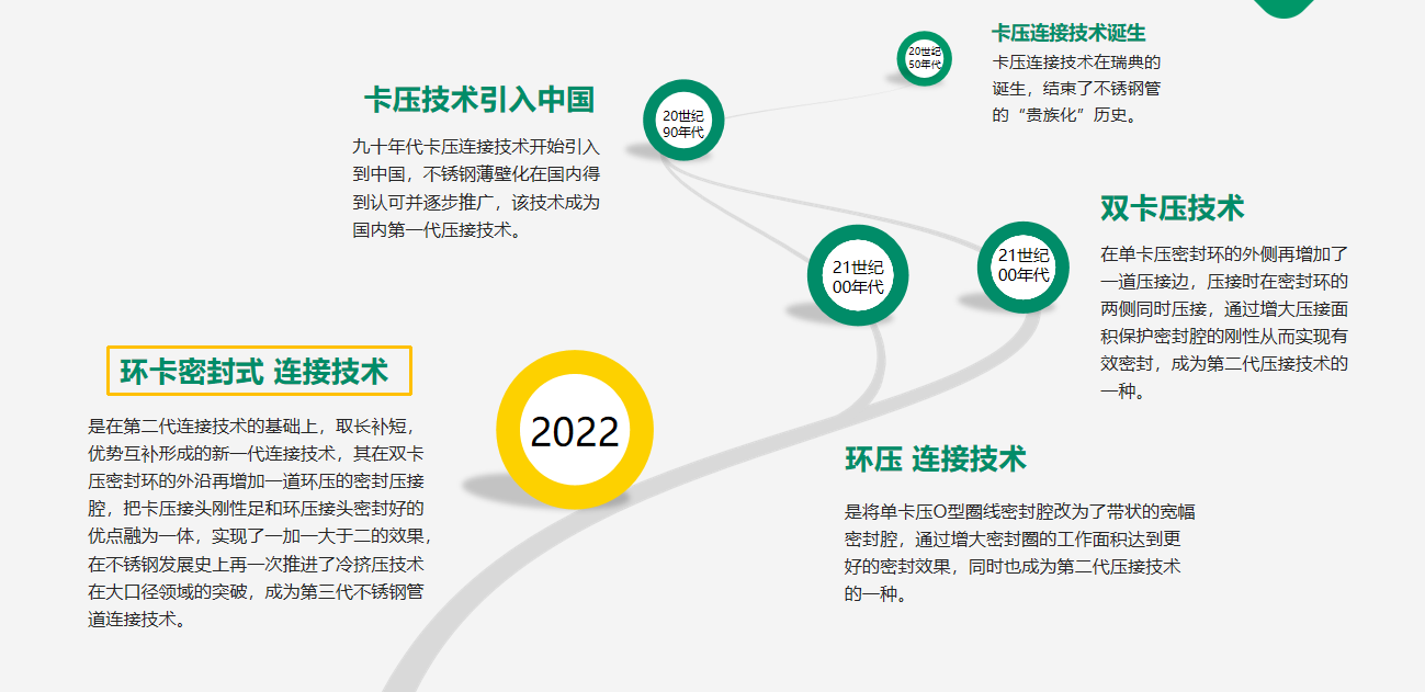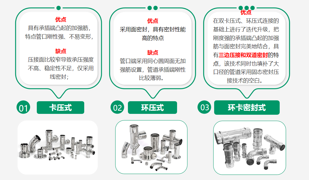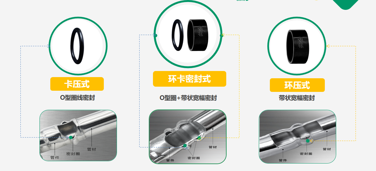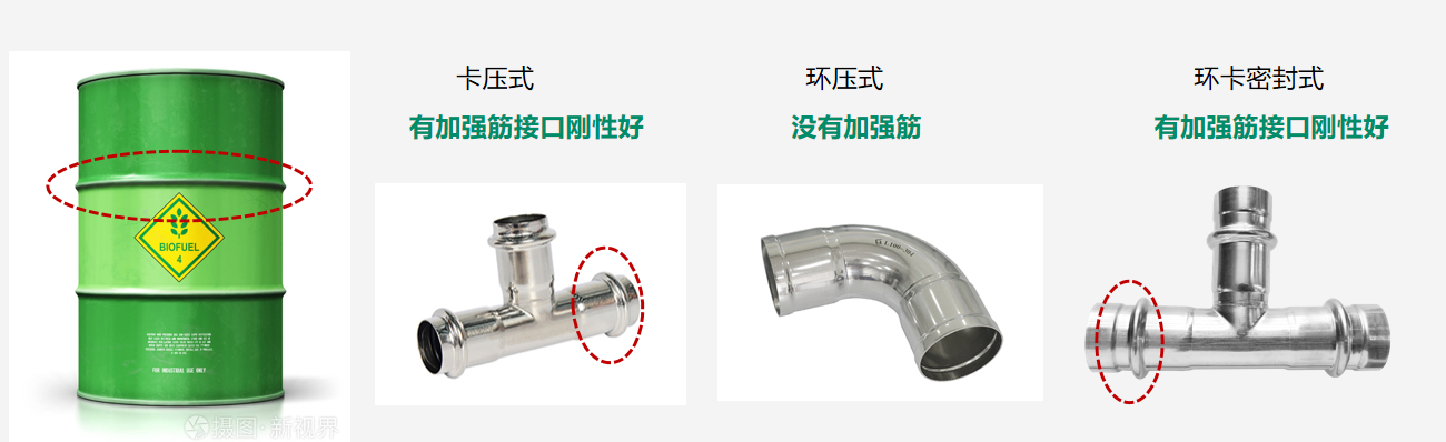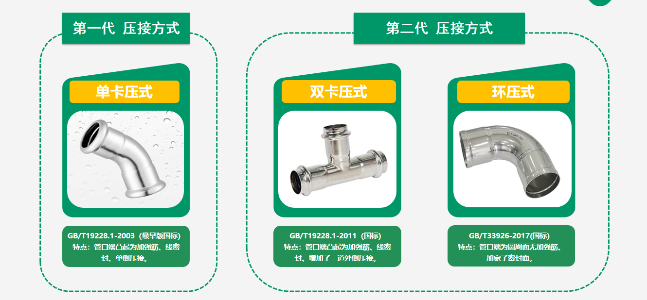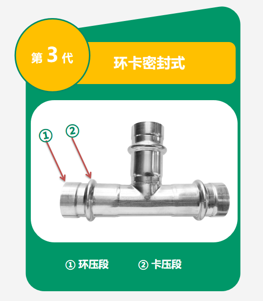 環(huán)卡密封式連接則是在科學(xué)分析第二代連接技術(shù)的基礎(chǔ)上,取長補短,優(yōu)勢互補形成的新一代連接技術(shù),其在雙卡壓密封環(huán)的外沿再增加一道環(huán)壓的密封壓接腔,把卡壓接頭剛性足和環(huán)壓接頭密封好的優(yōu)點融為一體,實現(xiàn)了一加一大于二的效果,在不銹鋼發(fā)展史上再一次推進(jìn)了冷擠壓技術(shù)在大口徑領(lǐng)域的突破,實現(xiàn)了DN200 — DN400的環(huán)卡密封式連接(卡壓連接只能到DN100,環(huán)壓連接到DN150),成為第三代不銹鋼管道連接技術(shù)。