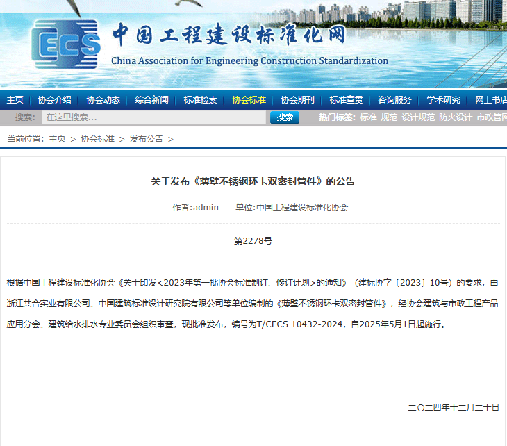 中國工程建設(shè)標準化網(wǎng)發(fā)布《薄壁不銹鋼環(huán)卡雙密封管件》的公告