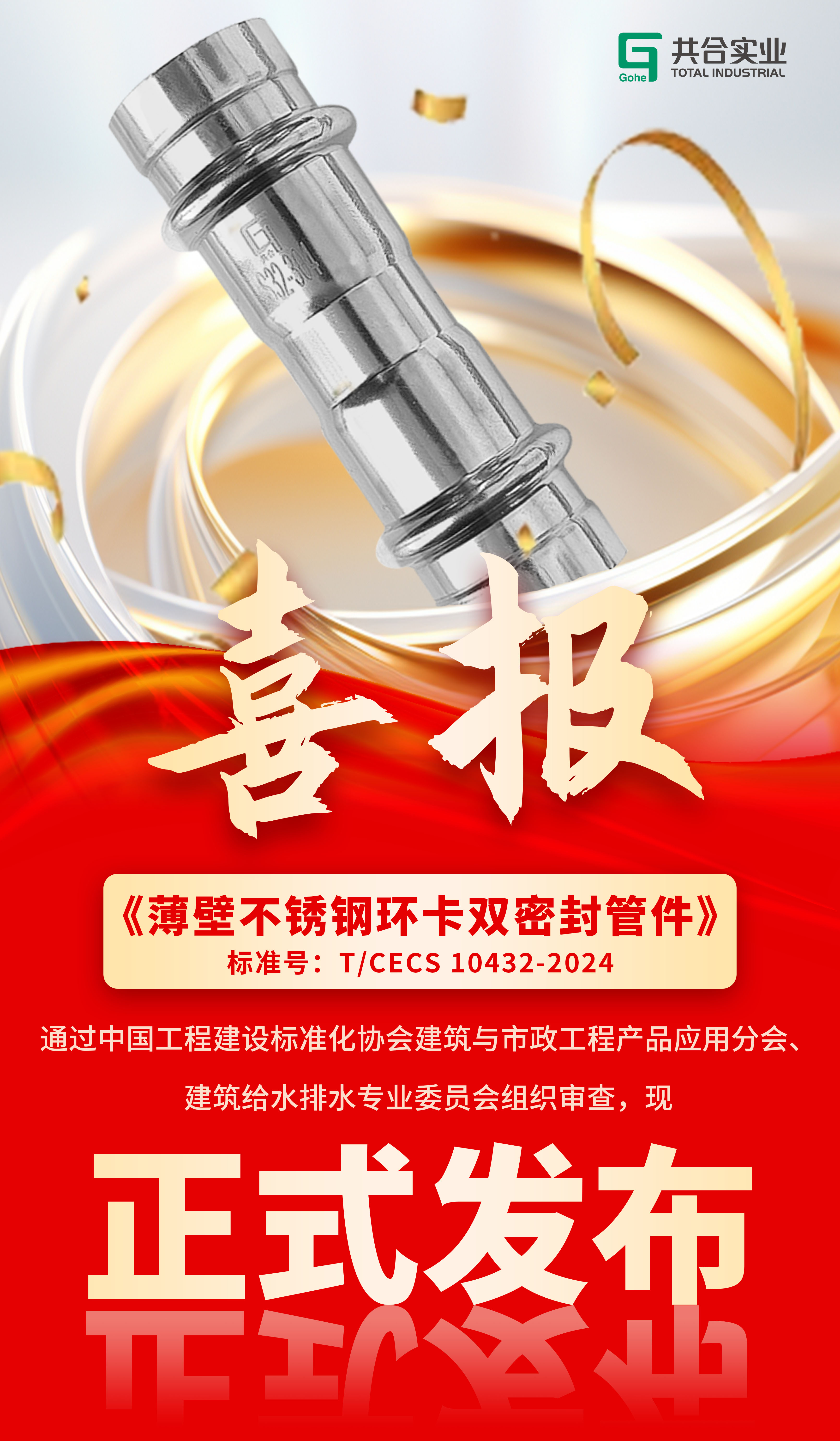 熱烈祝賀由浙江共合實業(yè)有限公司和中國建筑標準設(shè)計有限公司主編的中國工程建設(shè)標準化協(xié)會標準《薄壁不銹鋼環(huán)卡雙密封管件》(T/CECS10432-2024)正式發(fā)布,該標準的出臺填補了管道抗震防災(zāi)國內(nèi)空白,更為助力韌性城市建設(shè)提供了強有力的技術(shù)支撐!