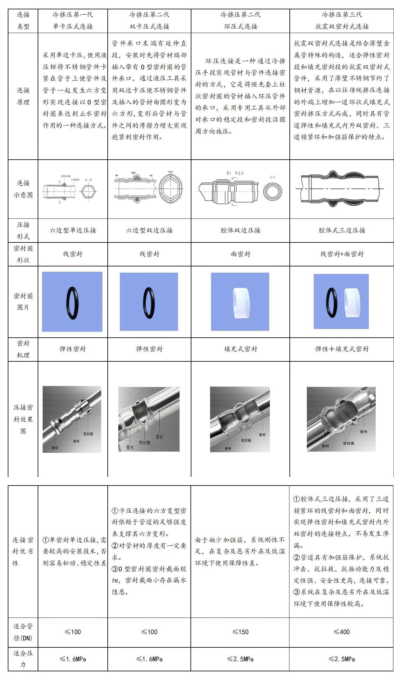 上世紀(jì)中期擠壓連接技術(shù)已在歐洲和美國(guó)大范圍應(yīng)用,于上世紀(jì)末傳入我國(guó)。最早生產(chǎn)卡壓產(chǎn)品的是無錫金羊?yàn)閱慰▔哼B接,隨后深圳雅昌引進(jìn)了雙卡壓產(chǎn)品,但均只能連接≤DN100口徑的管道;同期成都共同創(chuàng)立了環(huán)壓連接方式,將單卡壓的O形密封腔改為更寬幅度的圓筒狀密封腔,通過增大密封功能強(qiáng)化連接部位的密封性能,實(shí)現(xiàn)了DN150管道的環(huán)壓連接。但上述連接方式進(jìn)入市場(chǎng)已二十余年,始終未能解決更大口徑及更好密封管道的連接。
