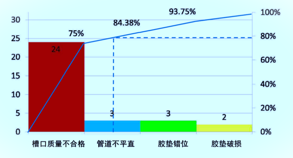 不合格原因包括:溝槽質(zhì)量不合格、管道不平直、膠墊錯(cuò)位、膠墊破損。其中溝槽質(zhì)量不合格占到質(zhì)量缺陷的75%,主要由三方面因素造成
