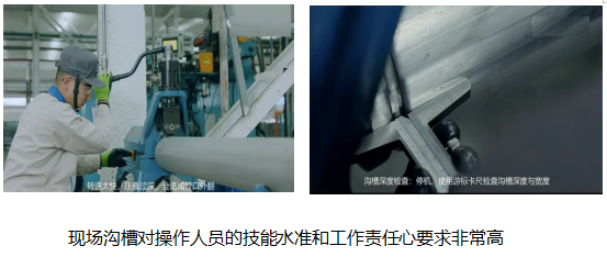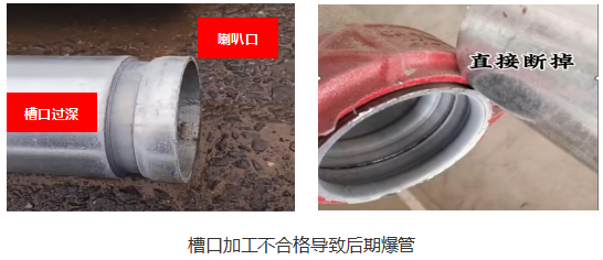鍍鋅鋼管的連接方式為DN50以下采用螺紋連接、DN65以上采用溝槽連接,這兩種連接方式都需要在工地現(xiàn)場對管端做預(yù)制加工后才能進(jìn)入管道的安裝工序,不符合裝配化施工的行業(yè)趨勢,容易留下人為質(zhì)量隱患因子。特別是DN65以上溝槽連接部分,按照國家標(biāo)準(zhǔn)規(guī)定,每個管端槽口加工需要控制的尺寸多達(dá)7個,且都是要求用游標(biāo)卡尺來控制,這樣的工藝要求與工地現(xiàn)場粗放的施工條件相差太大,因此我們經(jīng)常看見竣工交驗(yàn)后溝槽管道爆管和跑冒滴漏的現(xiàn)象。