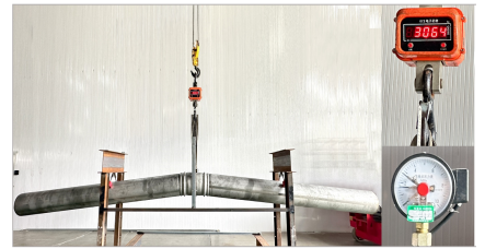 在抗震雙密封連接的偏轉(zhuǎn)角實(shí)驗(yàn)中,模擬管道遭遇大沖擊大變形的場景。選取兩段管徑為DN300、長度為3米的管和一個直接管件壓接為一套系統(tǒng),打入水壓2.75MPa,用吊車對連接部位上拉,當(dāng)偏轉(zhuǎn)角10°拉力3064kg時穩(wěn)壓30分鐘,系統(tǒng)未出現(xiàn)滲水,具備較強(qiáng)的抗震防災(zāi)能力。