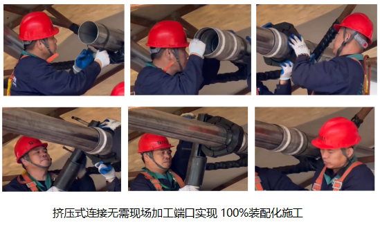 涂覆鋼管的連接工藝為冷擠壓式連接,其是利用金屬的剛性通過專用工具擠壓連接部位使之變形產(chǎn)生強(qiáng)大的抱緊力實(shí)現(xiàn)管道的連接,同時接口中的橡膠圈也通過擠壓產(chǎn)生壓強(qiáng)實(shí)現(xiàn)密封。由于環(huán)氧涂層的抗拉強(qiáng)度10MPa,國標(biāo)GB/T5135.20《自動噴水滅火系統(tǒng) 第20部分:涂覆鋼管》中壓扁試驗(yàn)要求的變形量為管徑的20%不能有裂紋和破壞,冷擠壓連接中對金屬管的變形量小于管徑的5%,因此壓接部位的涂層不會受到傷害,能夠有效的保證消防管道的超長服役。這種連接工藝不需要在現(xiàn)場加工預(yù)制,完全符合現(xiàn)代建筑“工廠化生產(chǎn),裝配化施工”的要求,有效避免了現(xiàn)場加工人為質(zhì)量隱患。