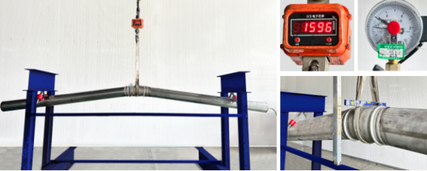管道的抗震防災(zāi)能力,直接關(guān)系到建筑在極端情況下的安全。為驗證抗震雙密封管道的性能,專業(yè)試驗給出了令人安心的數(shù)據(jù):選取兩段管徑 D150、長度 3 米的管道壓接成系統(tǒng),打入 2.75MPa 水壓后,用吊車對連接部位上拉,當(dāng)偏轉(zhuǎn)角度>15°、拉力達(dá)到最大值 1596KG 時停止,穩(wěn)壓 30 分鐘,系統(tǒng)未掉壓、接頭無滲水