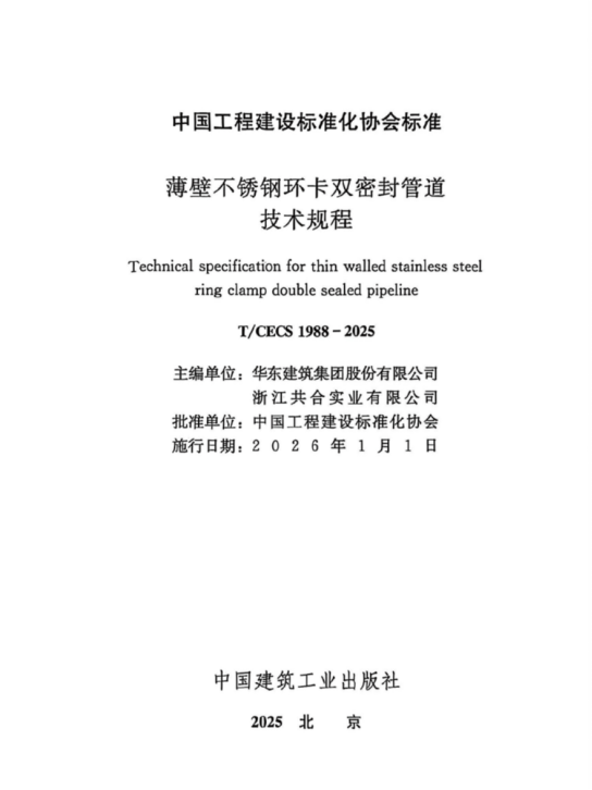 由華東建筑集團(tuán)股份有限公司主編,數(shù)十家國內(nèi)大中型設(shè)計(jì)院參編的中國工程建設(shè)標(biāo)準(zhǔn)化協(xié)會(huì)標(biāo)準(zhǔn)《薄壁不銹鋼環(huán)卡雙密封管道技術(shù)規(guī)程》T/CECS 1988-2025,已于 2026 年 1 月 1 日正式施行。